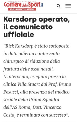 Bruno Pesucci, il chirurgo maxillo facciale che ha operato Edin Dzeko, ha parlato ai microfoni del Corriere dello Sport. Queste le sue dichiarazioni: “Si è trattato di una brutta frattura. Inizialmente sembrava rotto soltanto l’arco zigomatico, ma poi abbiamo riscontrato anche una frattura al margine inferiore dell’orbita dell’occhio destro. E’ stato necessario fare un intervento di osteosintesi, con l’utilizzo di una placca fissata da viti per stabilizzare l’orbita. Solo così si poteva contenere la frattura dell’arco zigomatico. La maschera? In carbonio, è leggera, protegge la zona, ma per un trauma così importante la maschera potrebbe non essere sufficiente. Per consolidare un osso ci vogliono tre o quattro settimane, il recupero definitivo avviene dopo venti giorni. Meglio andarci cauti, in questi casi non bisogna avere fretta” (Fonte: corrieregiallorosso.com)