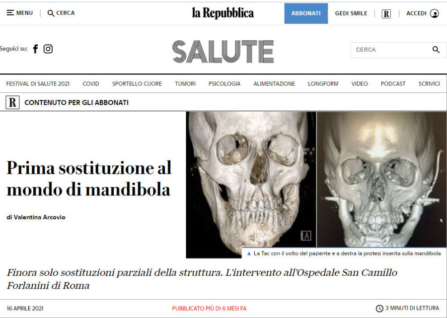 “Ma ha superato ogni nostra più entusiastica aspettativa”, racconta Bruno Pesucci, direttore dell’U.O.C di Chirurgia Maxillo-Facciale dell’Ospedale San Camillo-Forlanini di Roma, un vero e proprio luminare nel campo della chirurgia oncologica ricostruttiva. E' infatti Pesucci, 66 anni, milanese di origine, ma trapiantato a Roma da quasi 40 anni, che ha eseguito il primo intervento al mondo di sostituzione completa di una mandibola.