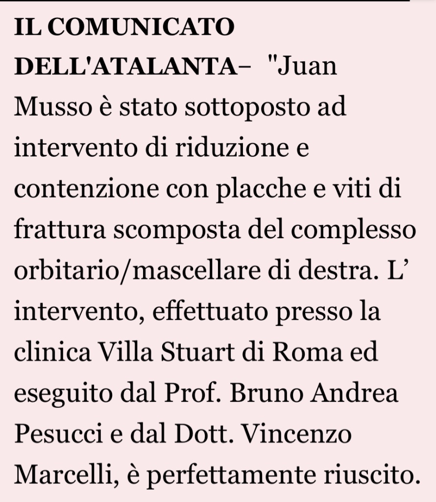 Musso ha lasciato il campo con il volto tumefatto, ma vigile e dopo una notte sotto osservazione passata al Policlinico Gemelli, è stato operato. Tramite un comunicato stampa, l’Atalanta fa sapere che “l’intervento, effettuato presso la clinica Villa Stuart di Roma ed eseguito dal Prof. Bruno Andrea Pesucci e dal Dott. Vincenzo Marcelli, è perfettamente riuscito”.
