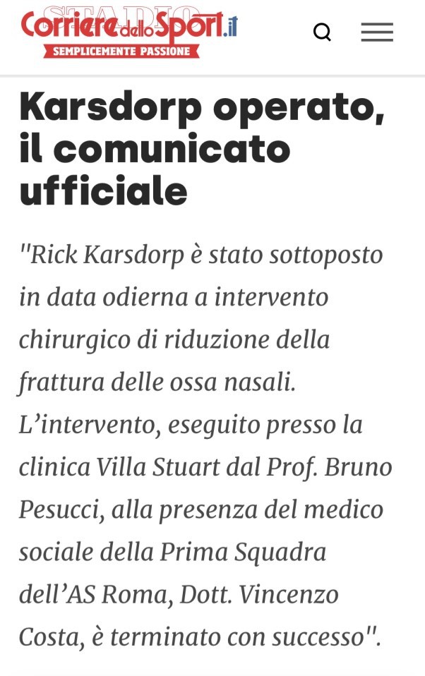“Ha perso molto sangue, si era formato un ematoma e con l’intervento abbiamo ridotto la frattura. Adesso ha i tamponi dentro le fosse nasali, è stato applicato uno splint protettivo sopra la piramide nasale per proteggere le ossa. I tamponi di tolgono venerdì, lunedì sarà rimosso anche lo splint. A quel punto il giocatore potrà riprendere un’attività atletica tranquilla. Potrà giocare con una maschera protettiva più piccola rispetto a quella di Dzeko, che copriva l’orbita oculare. La società deciderà quando farlo rientrare, il 6 agosto potrebbe giocare con la maschera, ma siamo proprio al limite. In un primo momento si pensava che già in serata potesse tornare a casa, invece avvertiva ancora molto dolore e quindi è rimasto sotto osservazione e domani mattina (oggi, ndr) tornerà tranquillamente a casa“.